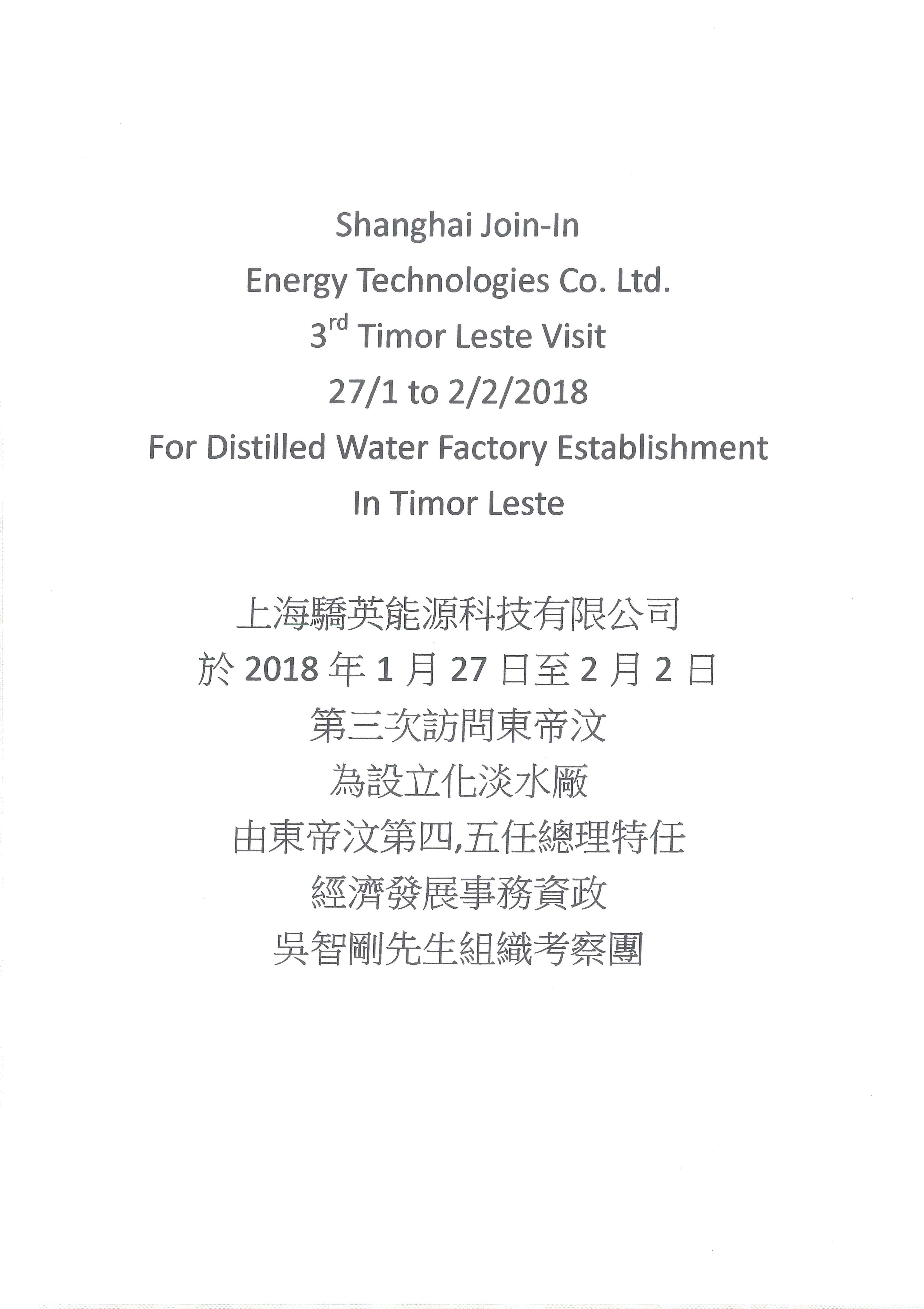 於2018年1月27日至2月2日第三次訪問東帝汶 為設立化淡水廠